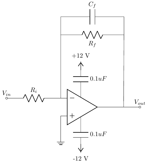\(R_f = R_i~= 3.3\,k\Omega\) and \(C_f = 470\,nF\).