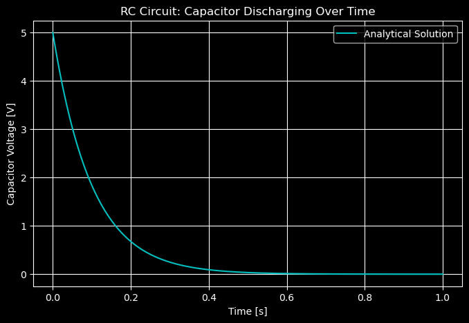 solution = solve_ivp(rlc_system, t_span, [v0, dvdt0], t_eval=t_eval, method='RK45')