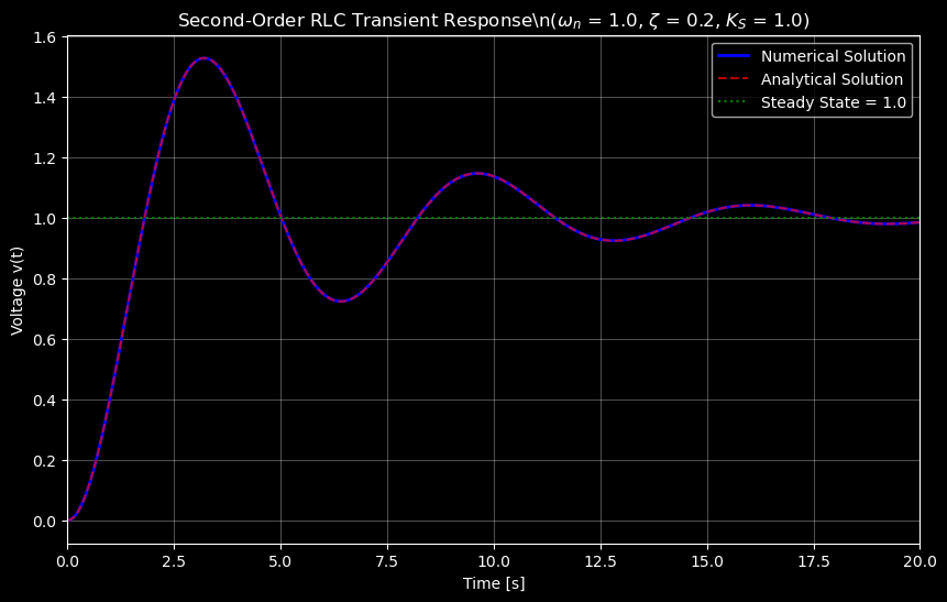 plt.title(rf'Second-Order RLC Transient Response\n($\omega_n$ = {omega_n}, $\zeta$ = {zeta}, $K_S$ = {K_S})')