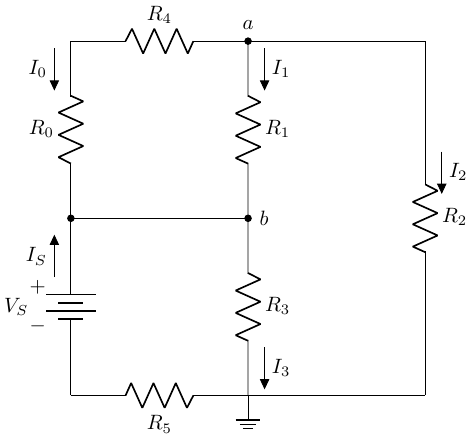 KCL Apply KCL to determine the unknown currents in the circuit below. Assume that \(I_0 = -2 A\), \(I_1 = -4 A\), \(I_S = 8 A\), and \(V_S = 12 V\).