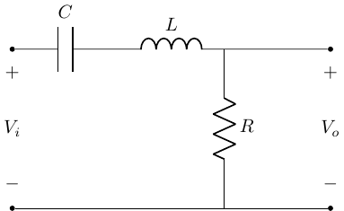 \[ \begin{gather} H(j\omega) = \frac{V_o(j\omega)}{V_i(j\omega)} = \frac{R}{R + \frac{1}{j\omega C} + j\omega L} \\ H(j\omega) = \frac{j\omega RC}{1 + j\omega RC - \omega^2 LC} \\ \end{gather} \]