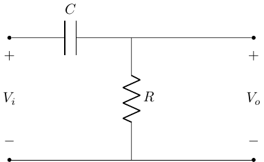 \[ V_o = V_i \frac{\frac{1}{j\omega C}}{R + \frac{1}{j \omega C}} \\ \]