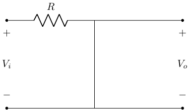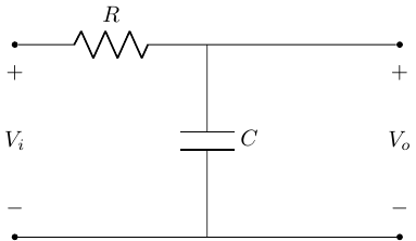 \[ \frac{V_o}{V_i} = \frac{1}{1 + j\omega RC} \\ \]