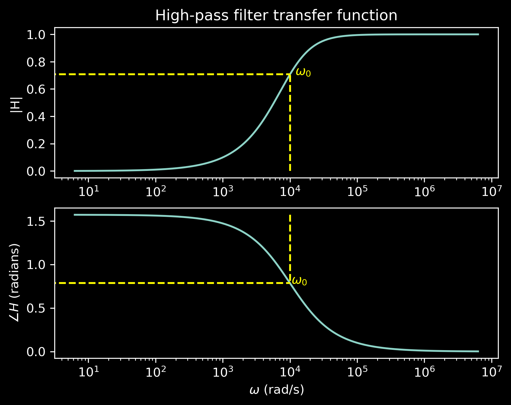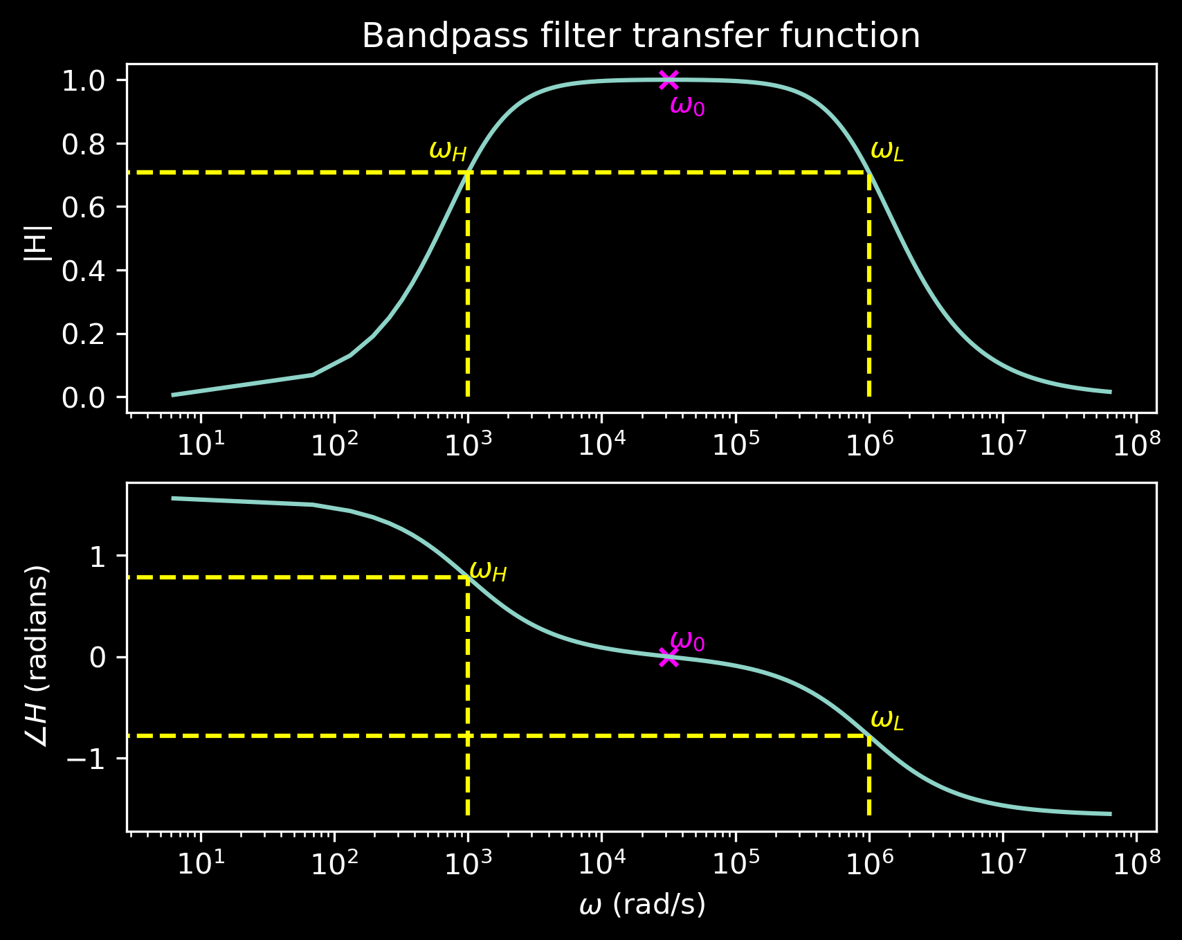 This is a second-order filter (two energy storage elements: \(L\) and \(C\)), so it has two cutoff frequencies: \(\omega_H\) and \(\omega_L\).