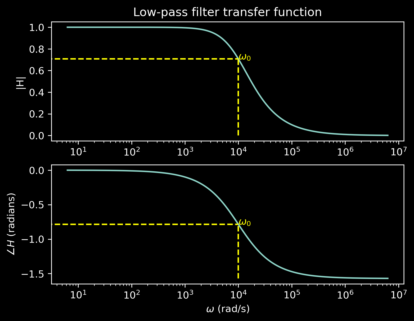 \[ \begin{gather} |\bar{H}(j\omega)| = \frac{1}{\sqrt{1 + (\omega RC)^2}} \\ \angle \bar{H}(j\omega) = -\tan^{-1}(\omega RC) \\ \end{gather} \]
