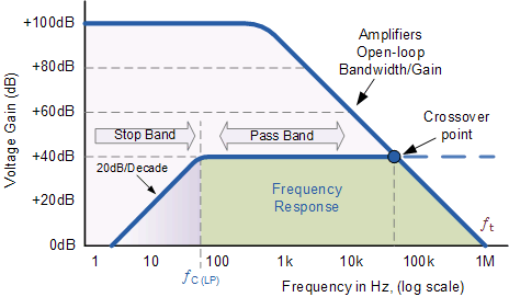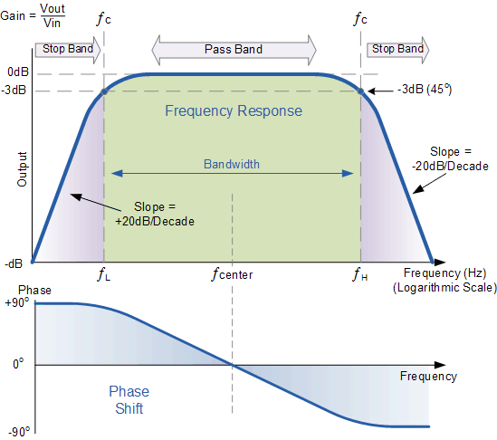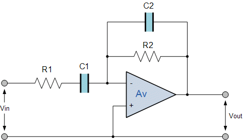 “Active” filters use op-amps to provide the possibility for gain \(>\) 0 dB, along with resistors and capacitors to achieve desired frequency response characteristics