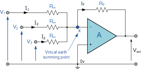 \[ \begin{gather} \frac{V_{in1}}{R_{1}} + \frac{V_{in2}}{R_{2}} = \frac{-V_{out}}{R_f} \\ V_{out} = -R_f \left( \frac{V_{in1}}{R_{1}} + \frac{V_{in2}}{R_{2}} \right) \end{gather} \]