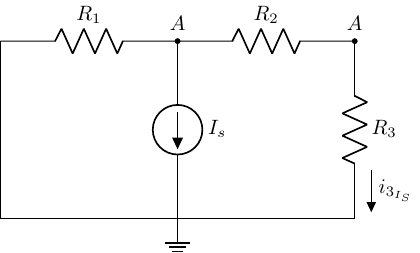 \[ I_{3_{I_S}} = \frac{v_A}{R_2+R_3} = -I_S\left(\frac{R_1}{R_1+R_2+R_3}\right) = -0.04 A \]