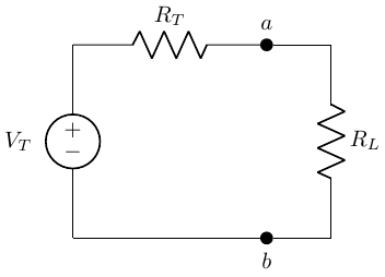 \[ \begin{gather} V_L = V_T \frac{R_L}{R_T+R_L} \\ i_L = \frac{v_L}{R_L} = \frac{V_T}{R_T+R_L} \end{gather} \]