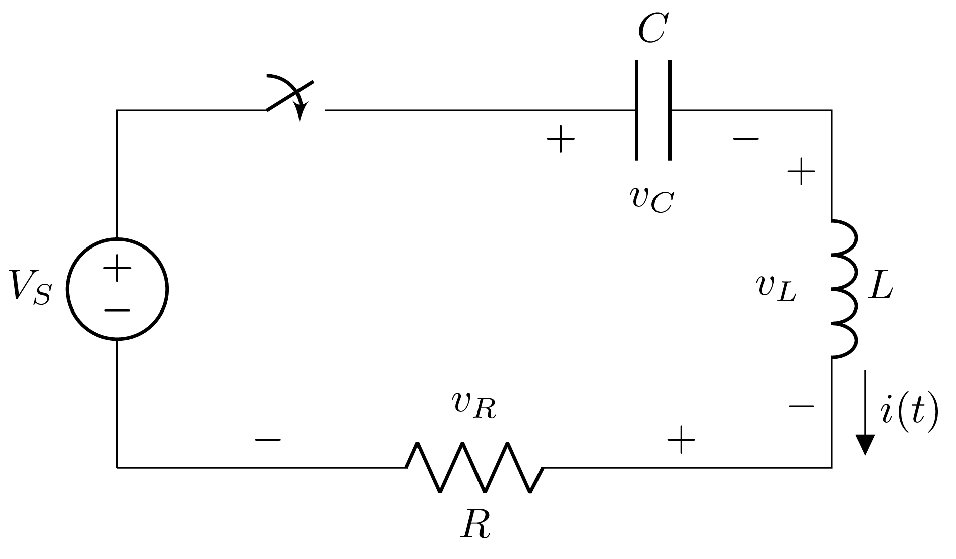 \[ V_S(t) = i(t) R + L \frac{d i(t)}{d t} + \frac{1}{C} \int_{0}^{t} i(t) dt + v_C(0) \\ \]