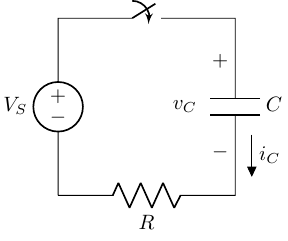 Closing the switch at \(t = t_0\) can be modeled as \(V_S\,u(t - t_0)\).